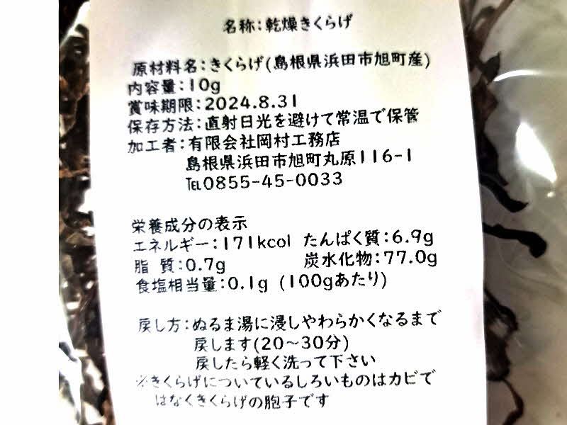 きくらげの豊富な栄養(植物繊維・カリウム・ビタミンD)が魅力的な商品です。個包装でお手軽にお使いいただけます。中華系の料理はもちろんのこと、みそ汁などの汁物や炊き込みご飯やおつまみの食材としてアレンジが楽しめます。スライスの乾燥きくらげは浜田市内の学校給食でお使いいただいています。(美味しまね認証所得)